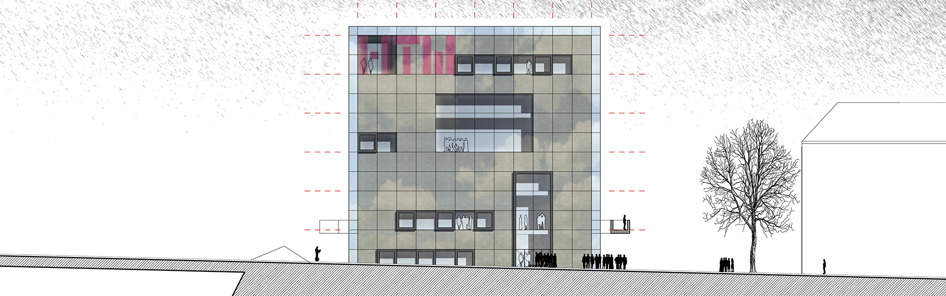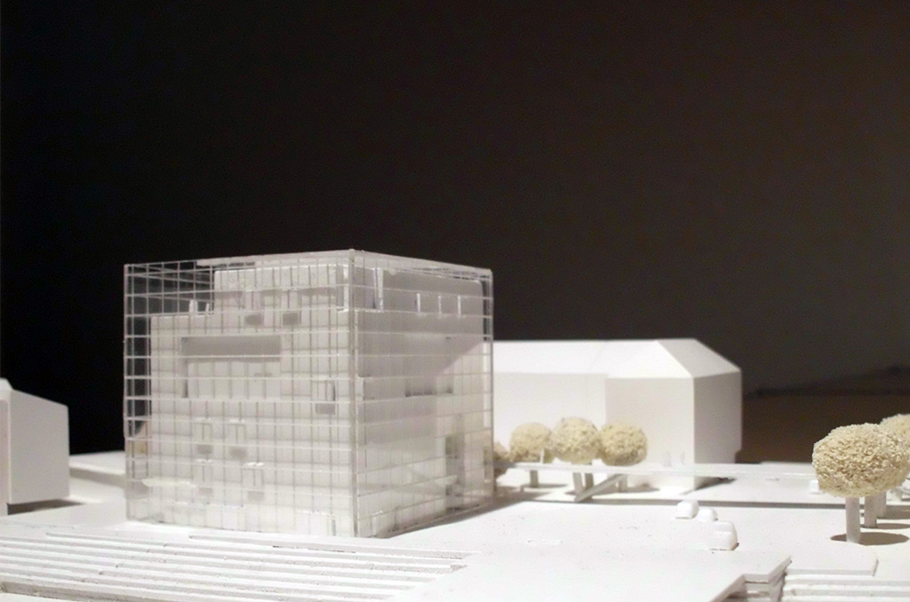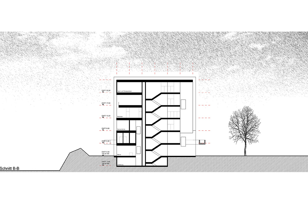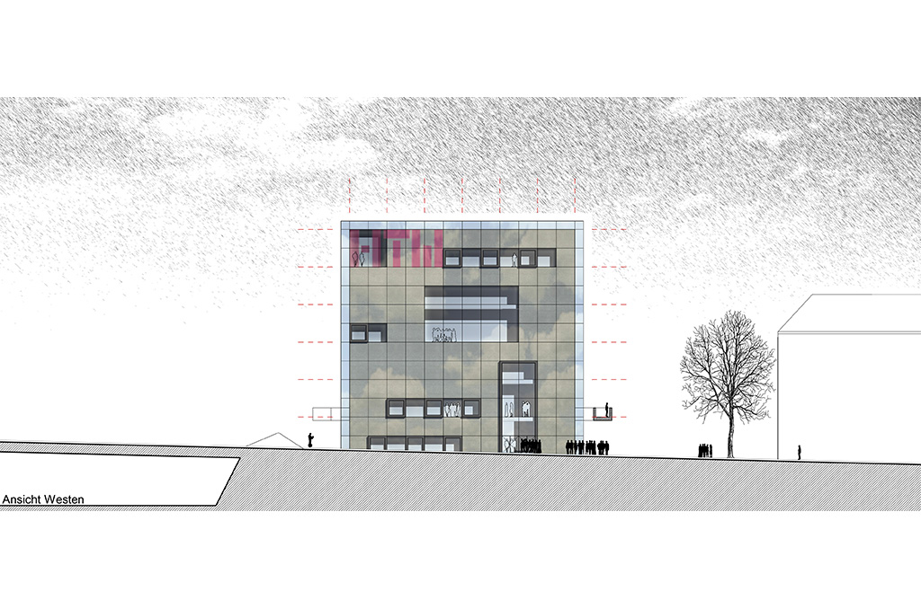 Die Hochschule für Technik und Wirtschaft des Saarlandes (HTW) sollte ein neues Zentralgebäude erhalten, welches als zentraler Anlaufpunkt Verwaltung, Mensa, Bibliothek sowie Hörsäle und Veranstaltungsräume erhalten sollte. Unser Entwurf sieht eine skulpturale Sichtbetonkonstruktion unter einer streng würfelförmigen Glaskonstruktion vor. Durch Betonkernaktivierung und Steuerung der Glasfassade über Sonnenschutz und Hinterströmung sollte das im Jahr 2009 geplante Gebäude ein innovatives, energetisches Konzept beinhalten, welches sich die natürlichen Zyklen der Jahres- und Tageszeiten zu Nutze machen konnte.