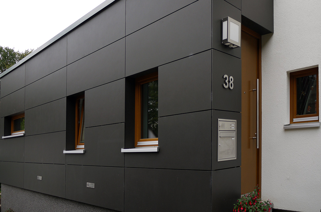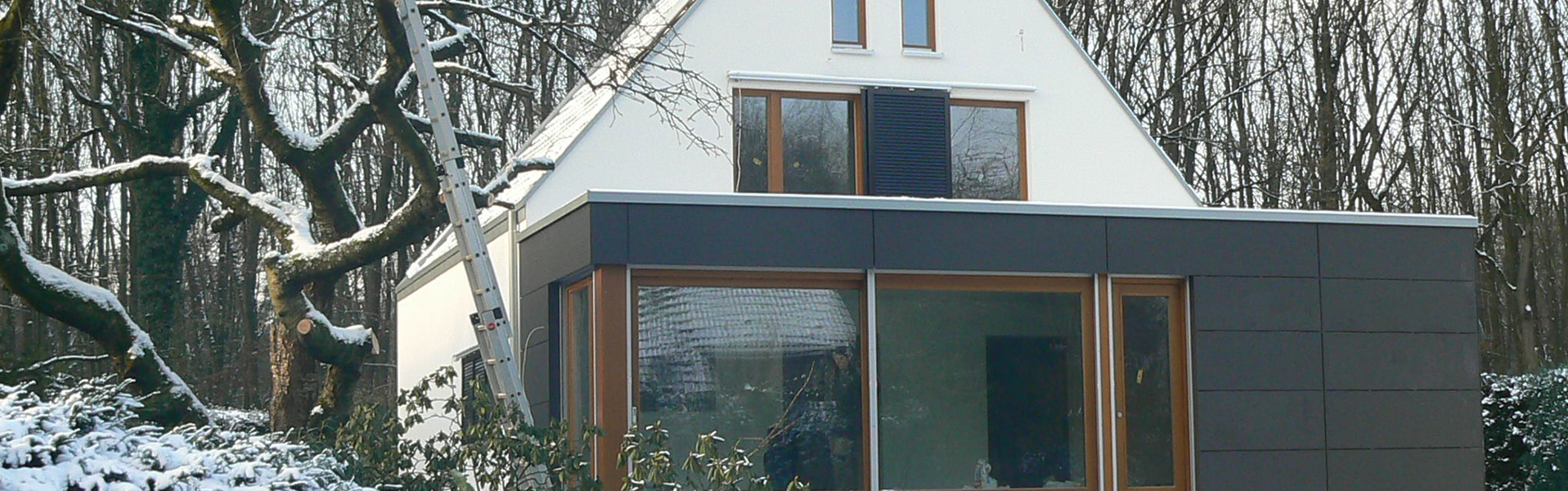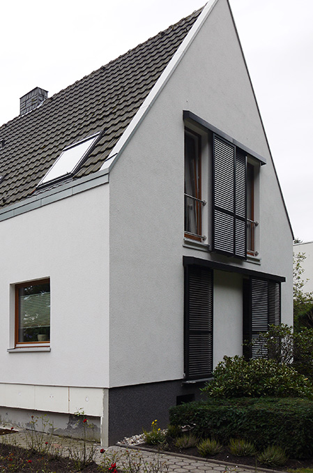 Ein Siedlungshaus aus der Nachkriegszeit sollte umgebaut und erweitert werden, um einer 4-köpfigen Familie ein neues und modernes Zuhause zu bieten. Hierzu wurden im Bestand Decken geöffnet, um die Kommunikation zwischen den Etagen zu ermöglichen und großzügige Räume zu schaffen. Im Erdgeschoss wurde ein Anbau realisiert, der sowohl den Eingangsbereich wie einen großzügig verglasten Wohnbereich zum Garten beinhaltet.
