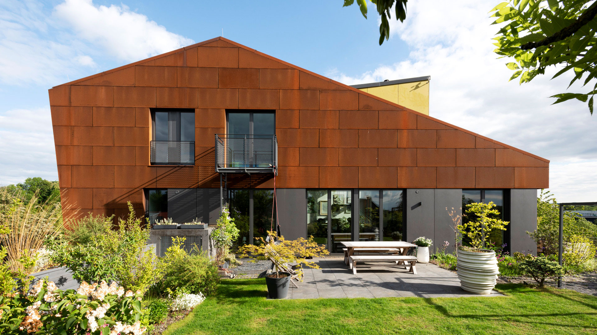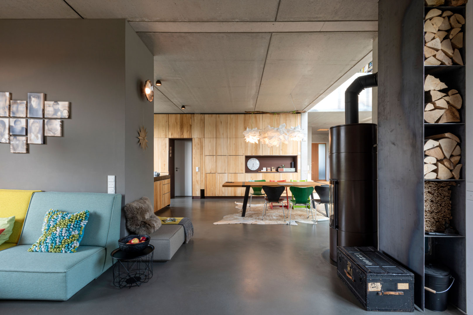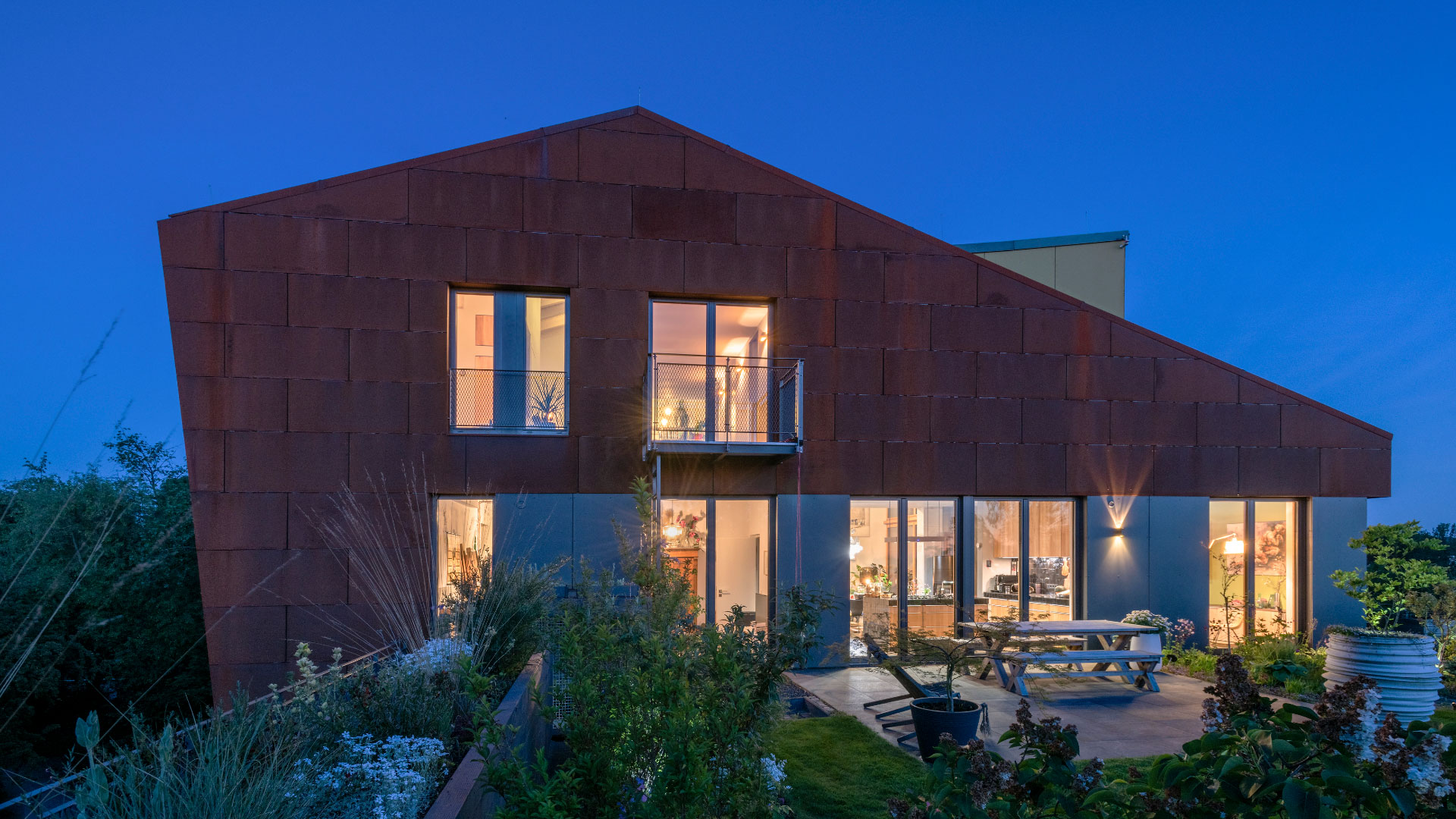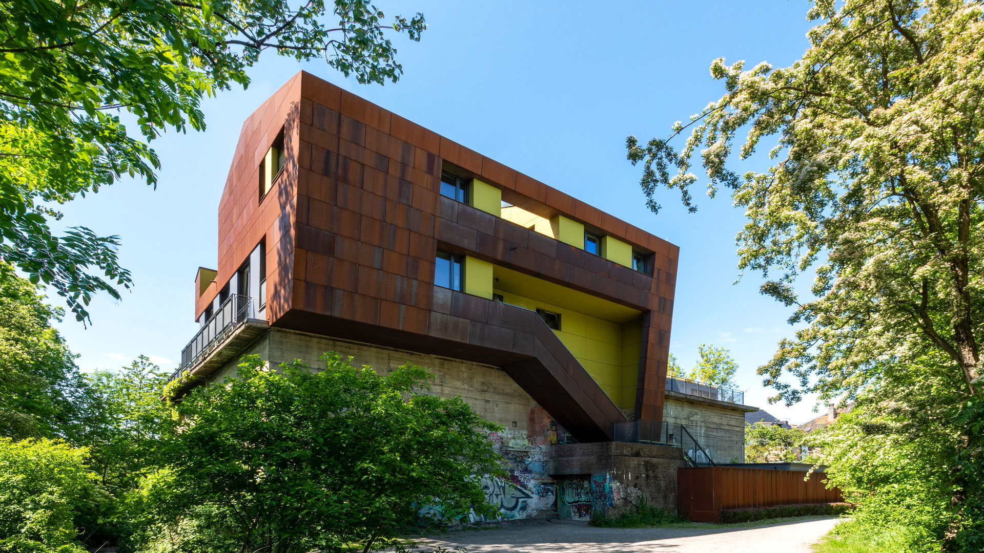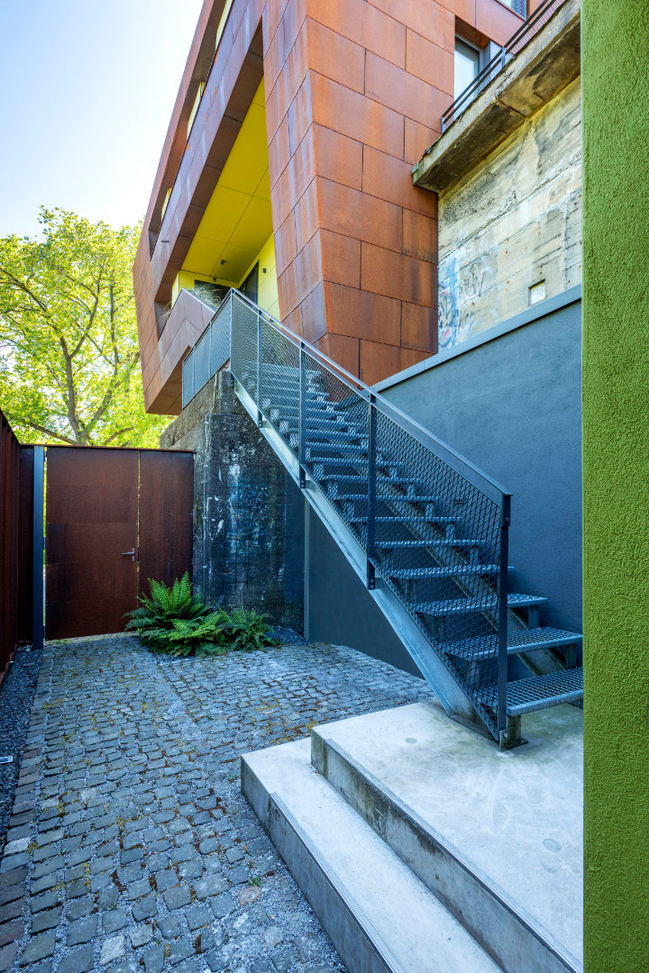 Als urbane Nachverdichtung wurde ein Zweifamilienhaus auf einem dreigeschossigen Bunker errichtet. Auf den Bunker wurde ein neuer überkragender Baukörper gesetzt, der den Charakter des gealterten und mit Graffiti versehenen Betonwürfels bewusst erhält und diesen mit einem ebenso rauen und durch die Witterung alternden Material kontrastiert. Die Verbindung von Sichtbeton und Cortenstahl setzt sich auch im Innern fort, wobei der Cortenstahl hier in seiner ursprünglichen gewalzten Form für Brüstungen, Treppen und Verkleidungen eingesetzt wird. Hier werden Sichtbeton, Stahl und geschliffener Estrich in Beziehung mit warmen Holzeinbauten und -fenstern gesetzt. Eingangs-, Wohn-, Küchen- und Essbereich fließen ineinander, erhalten jedoch Zonierungen und Rückzugsbereiche. Über einen komplett verglasten Luftraum wird die offene Wohnebene entlang einer Sichtbetonwand mit dem privateren Obergeschoss verbunden. Alle Räume und Verkehrswege sind so angeordnet, dass stets ein direkter Blick in den Außenbereich ermöglicht wird und das Haus lichtdurchströmt und offen wirkt. Durch die Nutzung der Dachflächen für intensive Begrünung und eine minimal genutzte Grundstücksfläche werden die neue Flächenversiegelung minimiert und neue Retentionsflächen geschaffen.