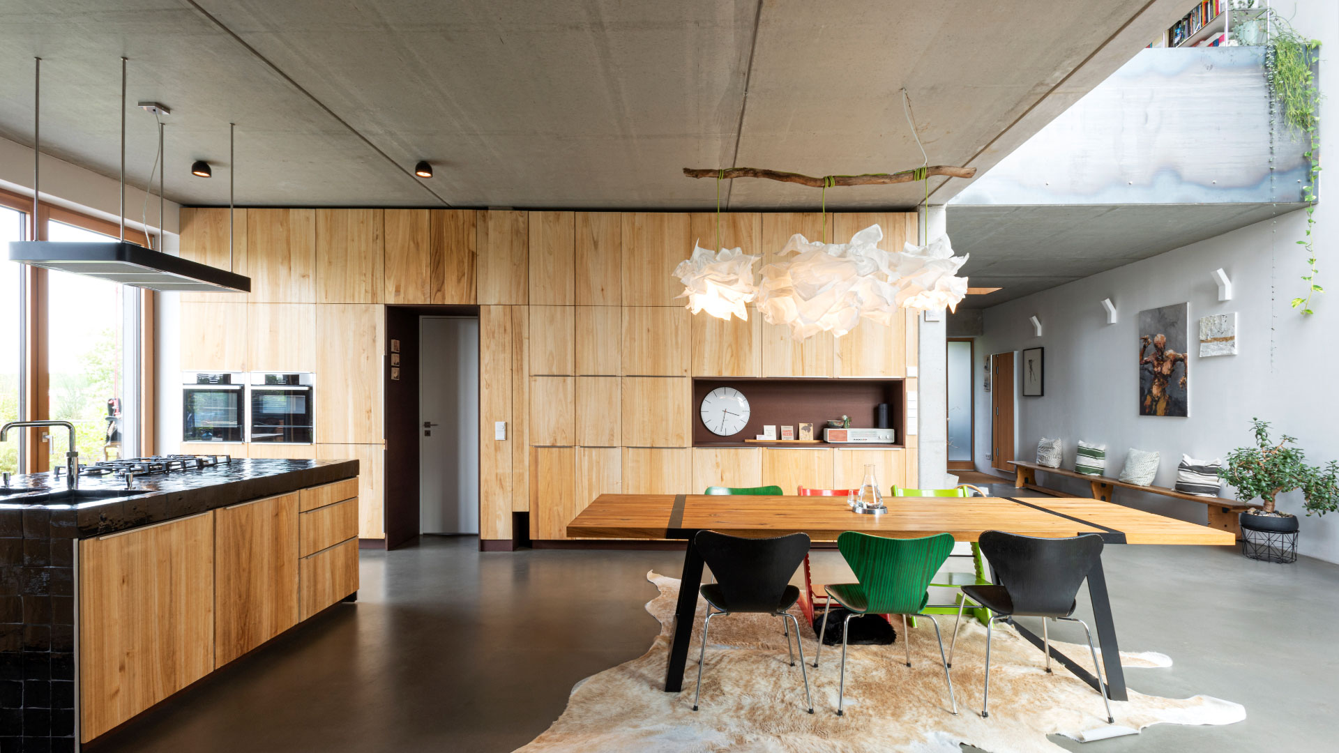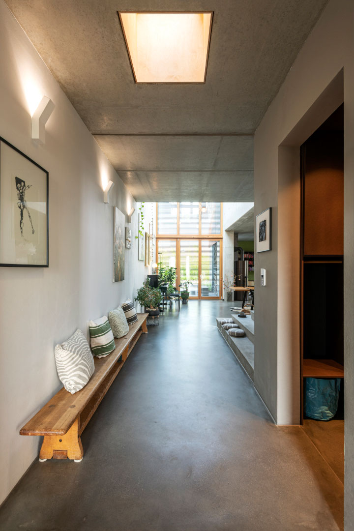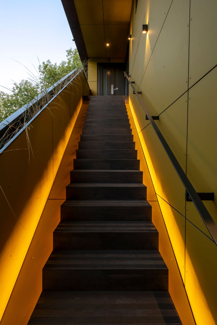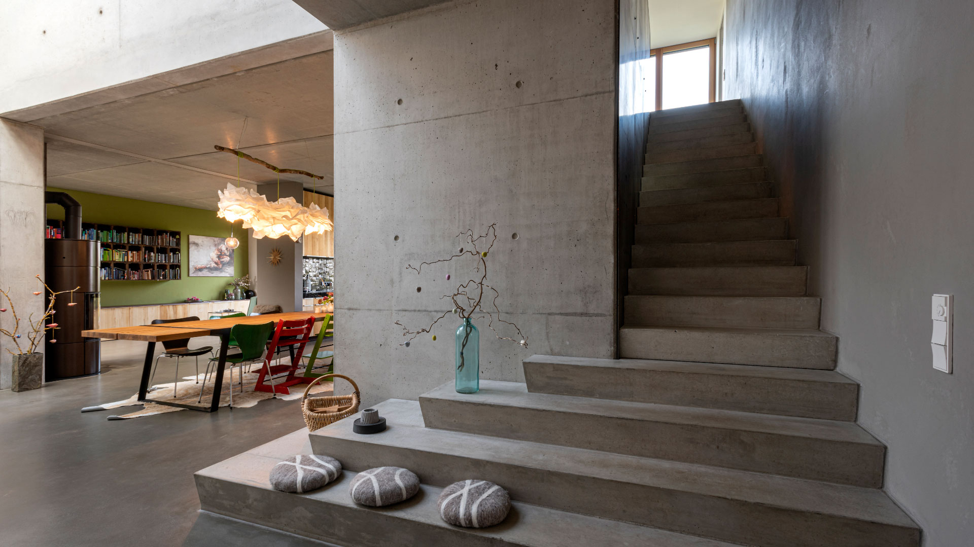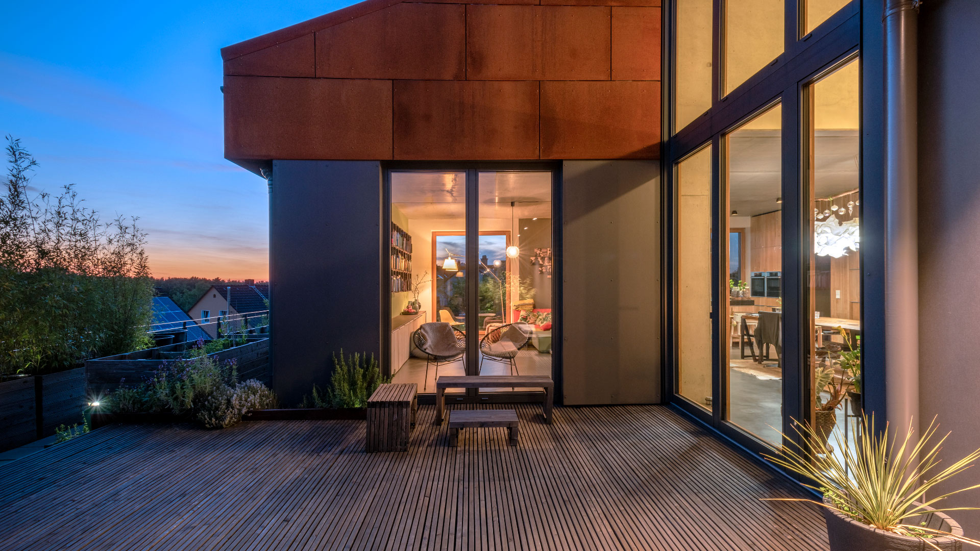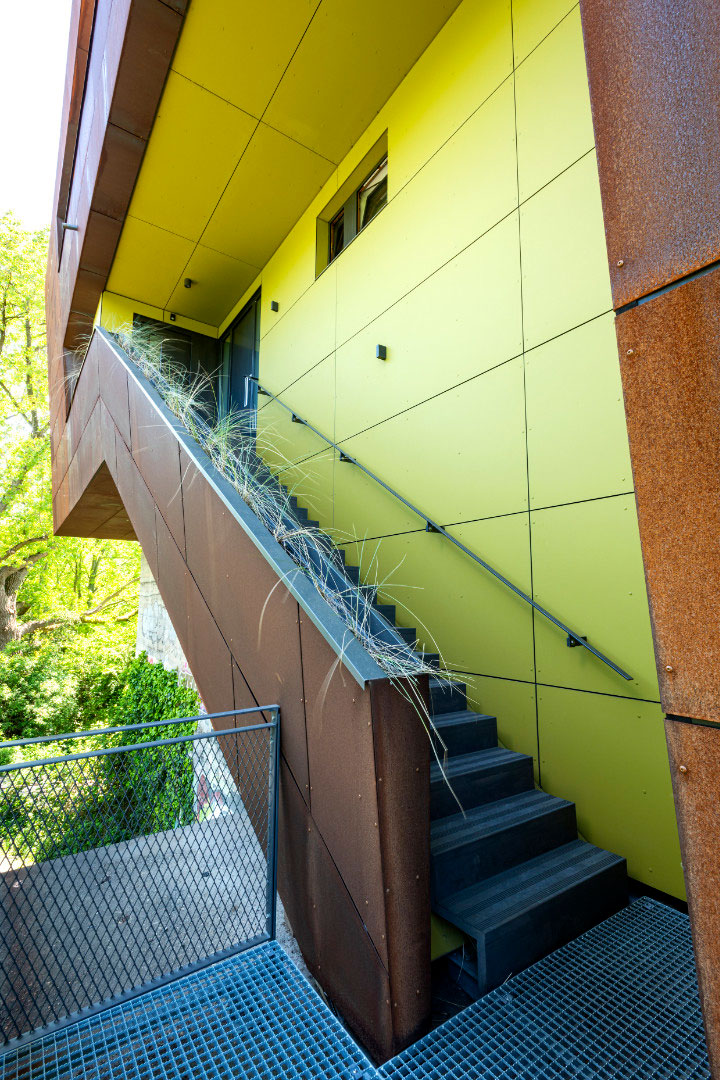 Als urbane Nachverdichtung wurde ein Zweifamilienhaus auf einem dreigeschossigen Bunker errichtet. Auf den Bunker wurde ein neuer überkragender Baukörper gesetzt, der den Charakter des gealterten und mit Graffiti versehenen Betonwürfels bewusst erhält und diesen mit einem ebenso rauen und durch die Witterung alternden Material kontrastiert. Die Verbindung von Sichtbeton und Cortenstahl setzt sich auch im Innern fort, wobei der Cortenstahl hier in seiner ursprünglichen gewalzten Form für Brüstungen, Treppen und Verkleidungen eingesetzt wird. Hier werden Sichtbeton, Stahl und geschliffener Estrich in Beziehung mit warmen Holzeinbauten und -fenstern gesetzt. Eingangs-, Wohn-, Küchen- und Essbereich fließen ineinander, erhalten jedoch Zonierungen und Rückzugsbereiche. Über einen komplett verglasten Luftraum wird die offene Wohnebene entlang einer Sichtbetonwand mit dem privateren Obergeschoss verbunden. Alle Räume und Verkehrswege sind so angeordnet, dass stets ein direkter Blick in den Außenbereich ermöglicht wird und das Haus lichtdurchströmt und offen wirkt. Durch die Nutzung der Dachflächen für intensive Begrünung und eine minimal genutzte Grundstücksfläche werden die neue Flächenversiegelung minimiert und neue Retentionsflächen geschaffen.