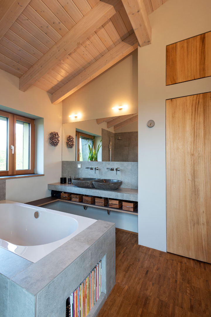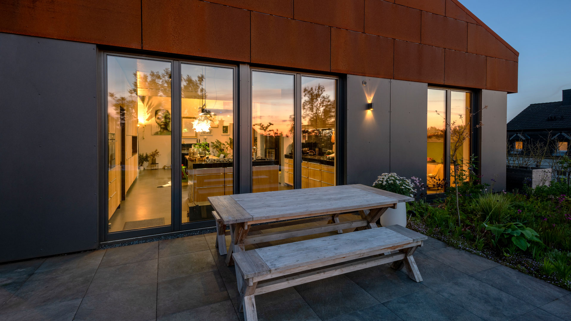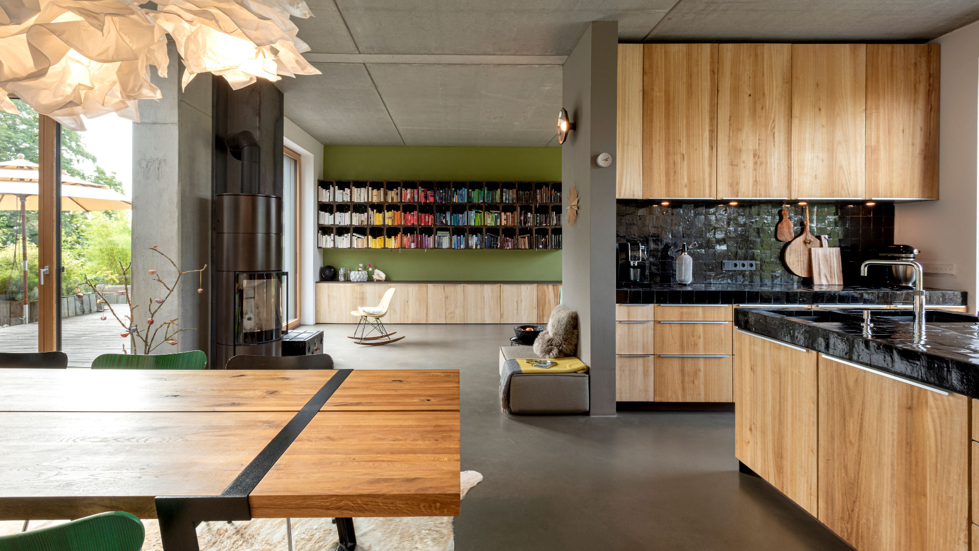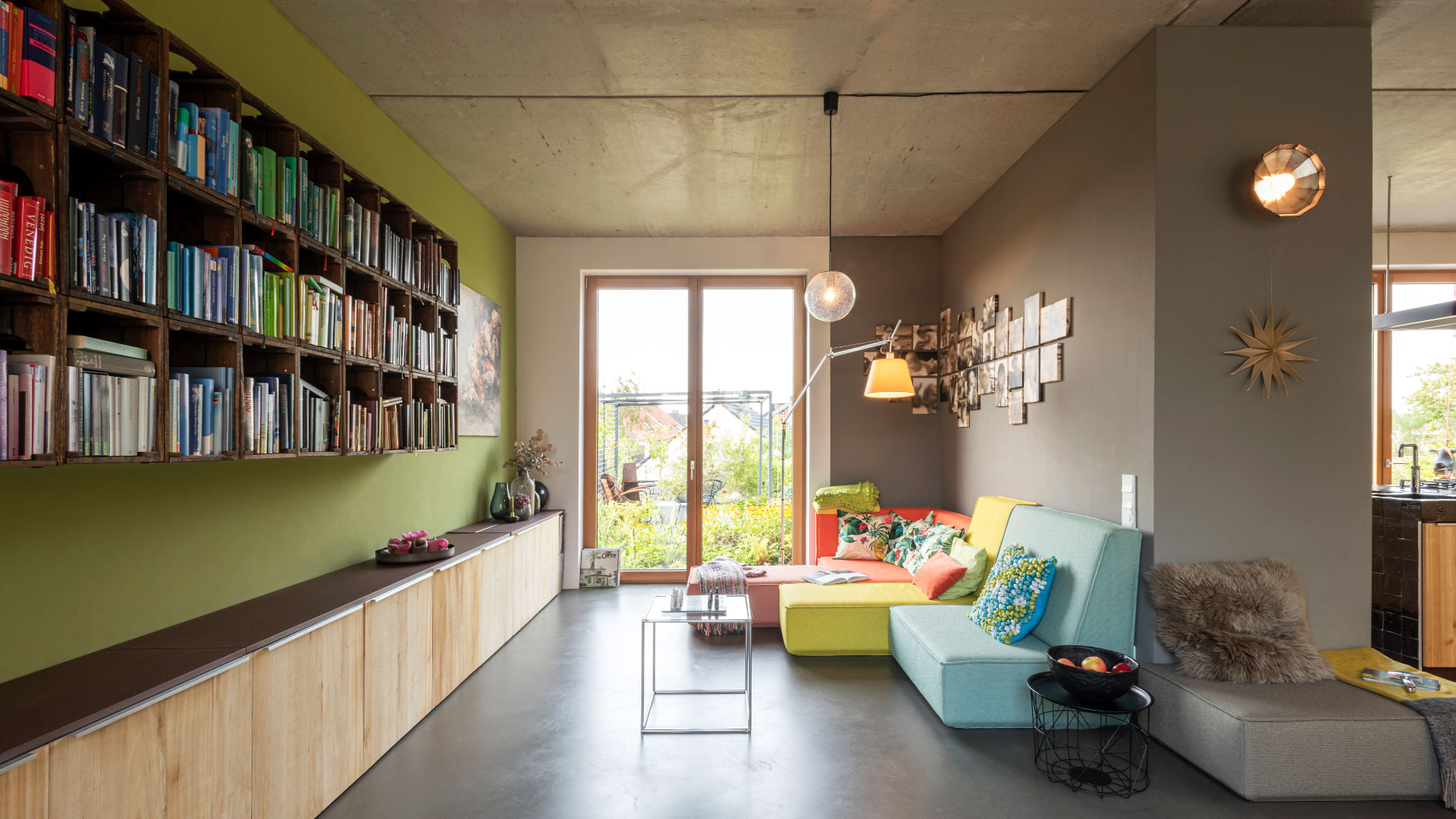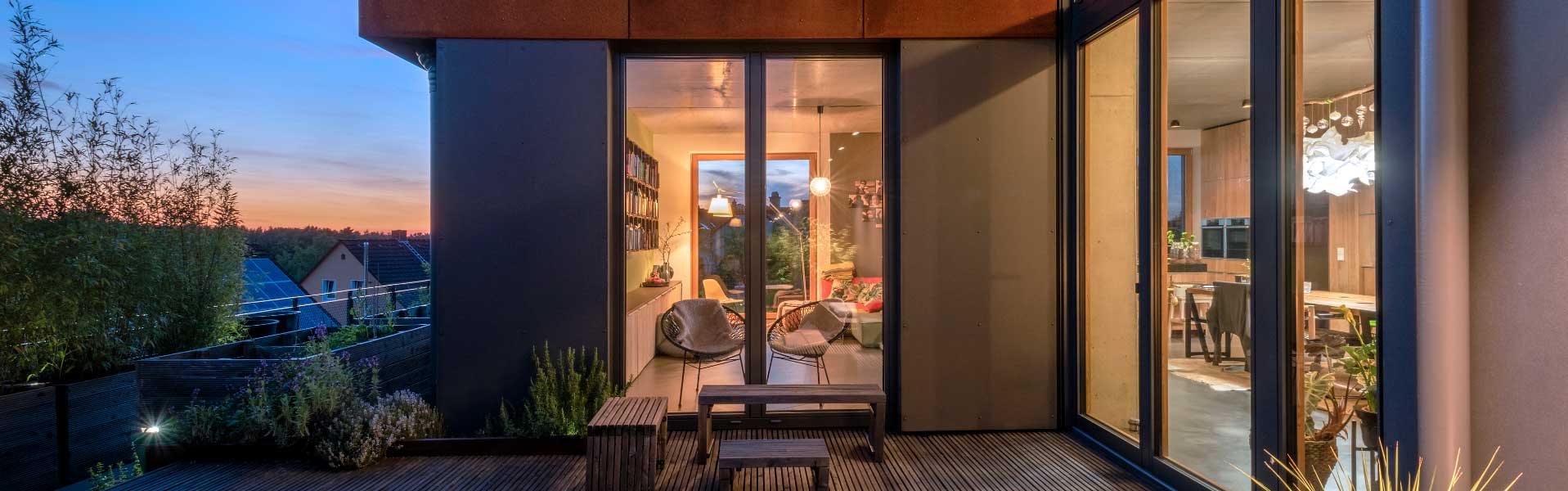 Als urbane Nachverdichtung wurde ein Zweifamilienhaus auf einem dreigeschossigen Bunker errichtet. Auf den Bunker wurde ein neuer überkragender Baukörper gesetzt, der den Charakter des gealterten und mit Graffiti versehenen Betonwürfels bewusst erhält und diesen mit einem ebenso rauen und durch die Witterung alternden Material kontrastiert. Die Verbindung von Sichtbeton und Cortenstahl setzt sich auch im Innern fort, wobei der Cortenstahl hier in seiner ursprünglichen gewalzten Form für Brüstungen, Treppen und Verkleidungen eingesetzt wird. Hier werden Sichtbeton, Stahl und geschliffener Estrich in Beziehung mit warmen Holzeinbauten und -fenstern gesetzt. Eingangs-, Wohn-, Küchen- und Essbereich fließen ineinander, erhalten jedoch Zonierungen und Rückzugsbereiche. Über einen komplett verglasten Luftraum wird die offene Wohnebene entlang einer Sichtbetonwand mit dem privateren Obergeschoss verbunden. Alle Räume und Verkehrswege sind so angeordnet, dass stets ein direkter Blick in den Außenbereich ermöglicht wird und das Haus lichtdurchströmt und offen wirkt. Durch die Nutzung der Dachflächen für intensive Begrünung und eine minimal genutzte Grundstücksfläche werden die neue Flächenversiegelung minimiert und neue Retentionsflächen geschaffen.