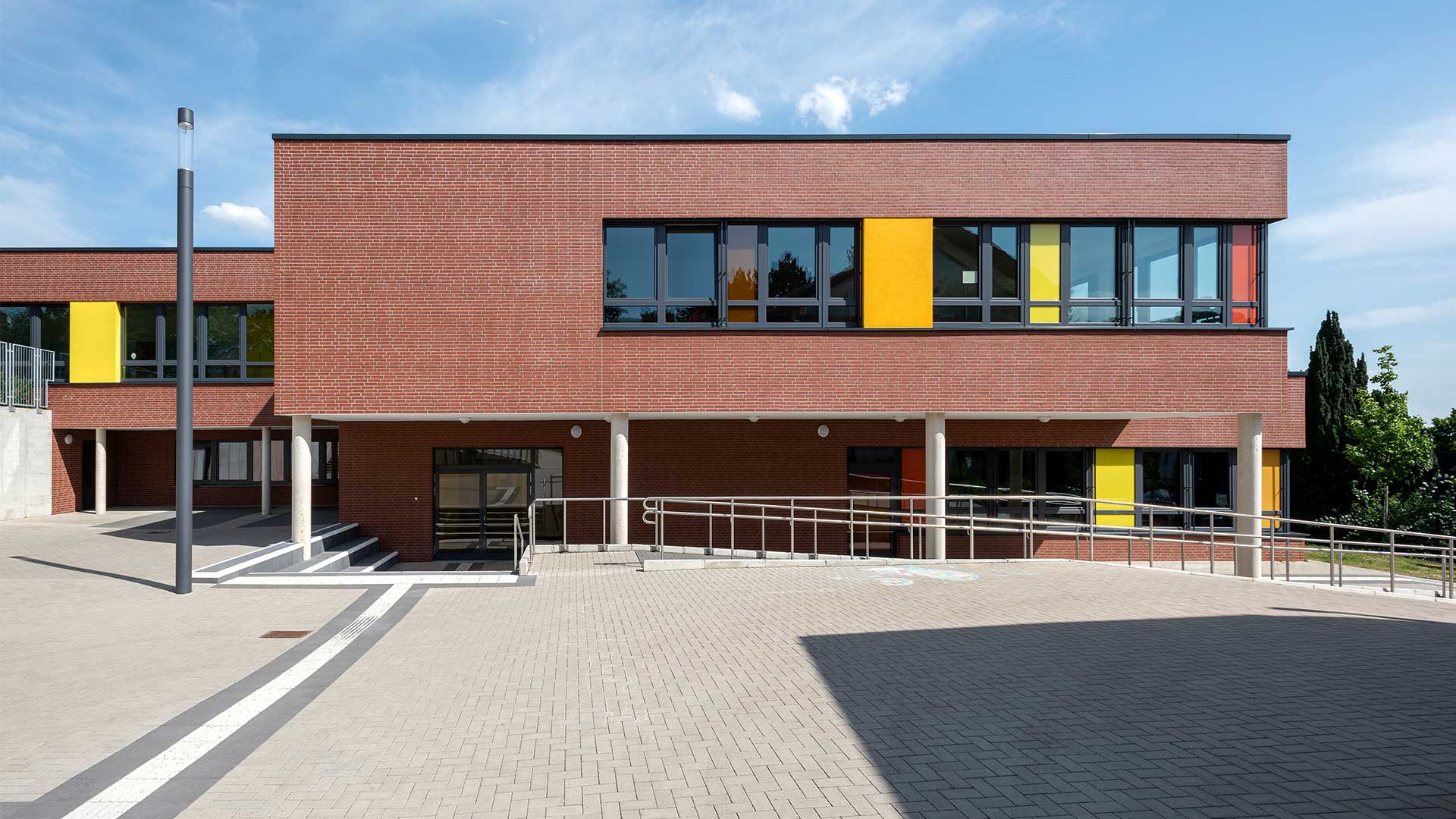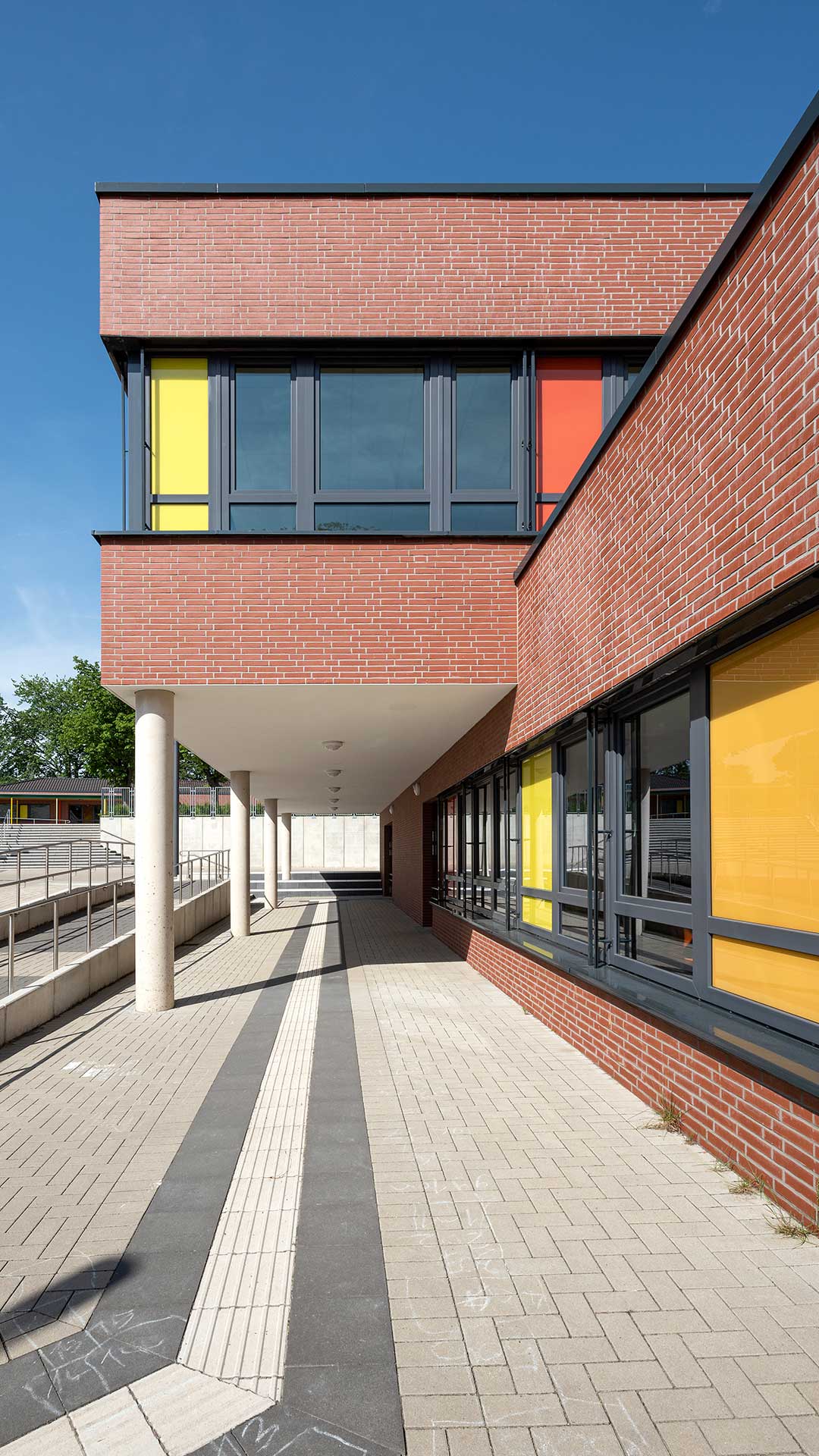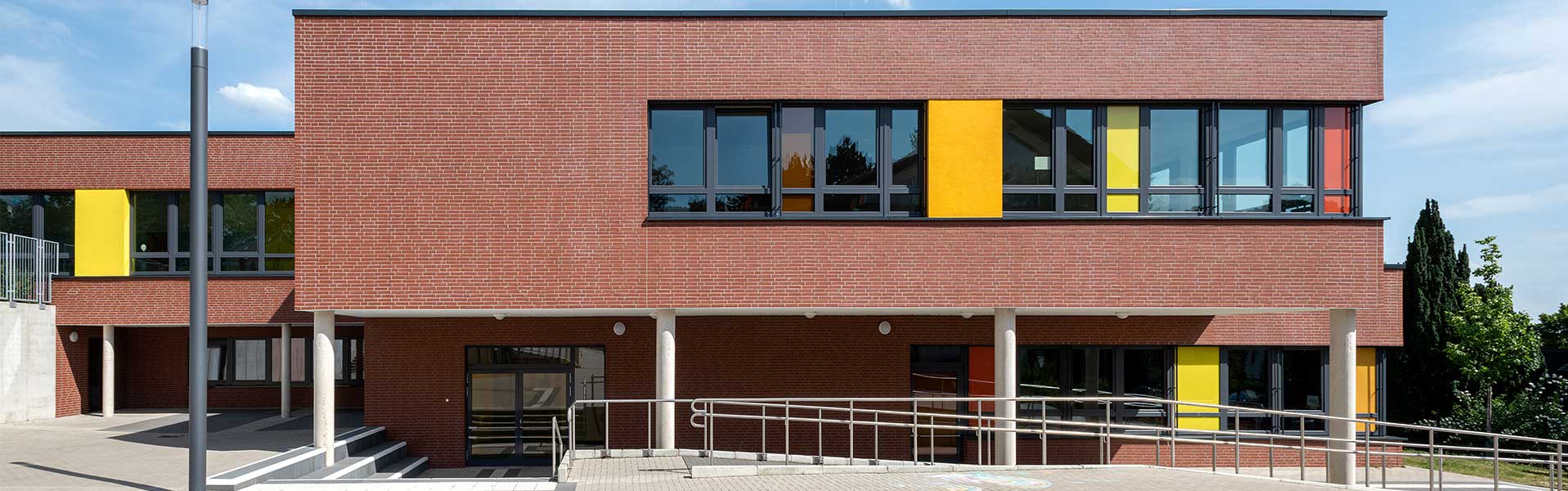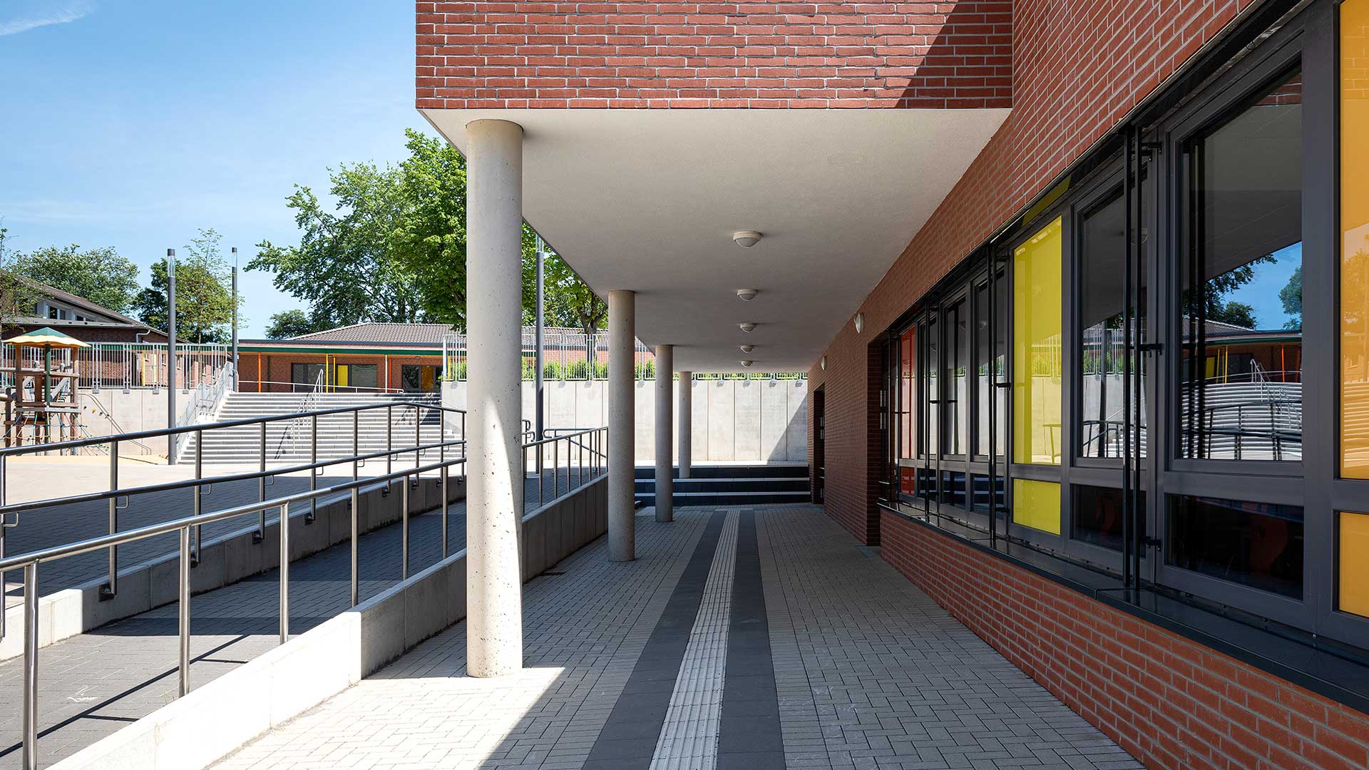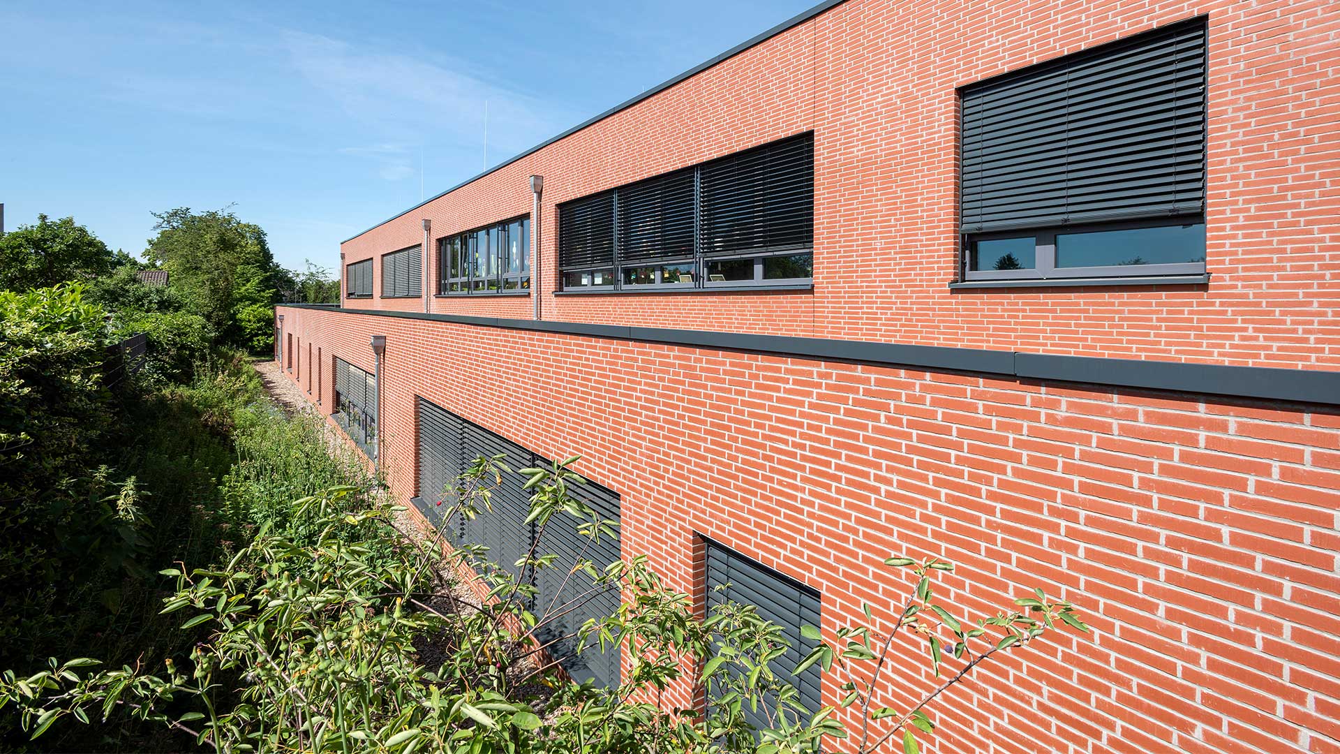 Der Gebäudebestand der Düsseldorfer Wichernschule aus dem Baujahr 1950 wird dem aktuellen Bedarf der Schule angepasst und erhält eine umfangreiche Erweiterung. Das Grundstück liegt an einem über 6 Höhenmeter überwindenden Südhang und ist durch seine Topografie gegliedert. So teilt ein Höhenversprung den mittig gelegenen Schulhof in zwei Ebenen. Der bestehende Gebäudekomplex folgt der Topographie und beinhaltet zwei Baukörper in L-Form. Die Erweiterung schließt die bestehenden Baulücken zwischen dem Bestand und rahmt den innenliegenden Schulhof. Der Neubau orientiert sich im Norden an die bestehende Gebäudeform nutzt dann aber die Topographie des Grundstücks, um in einen modernen zweigeschossigen Anbau im Süden zu übergehen. Durch ein zum Hof versetztes Erdgeschoss entsteht ein im Westen überdachter Eingangsbereich vor der neuen Mensa.