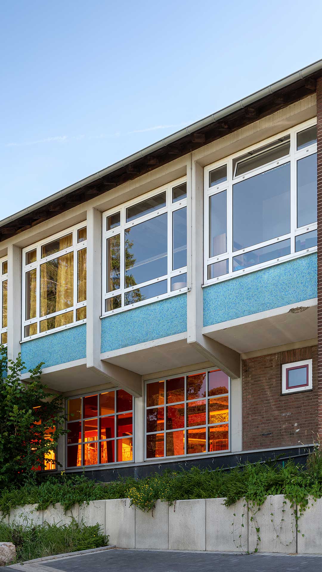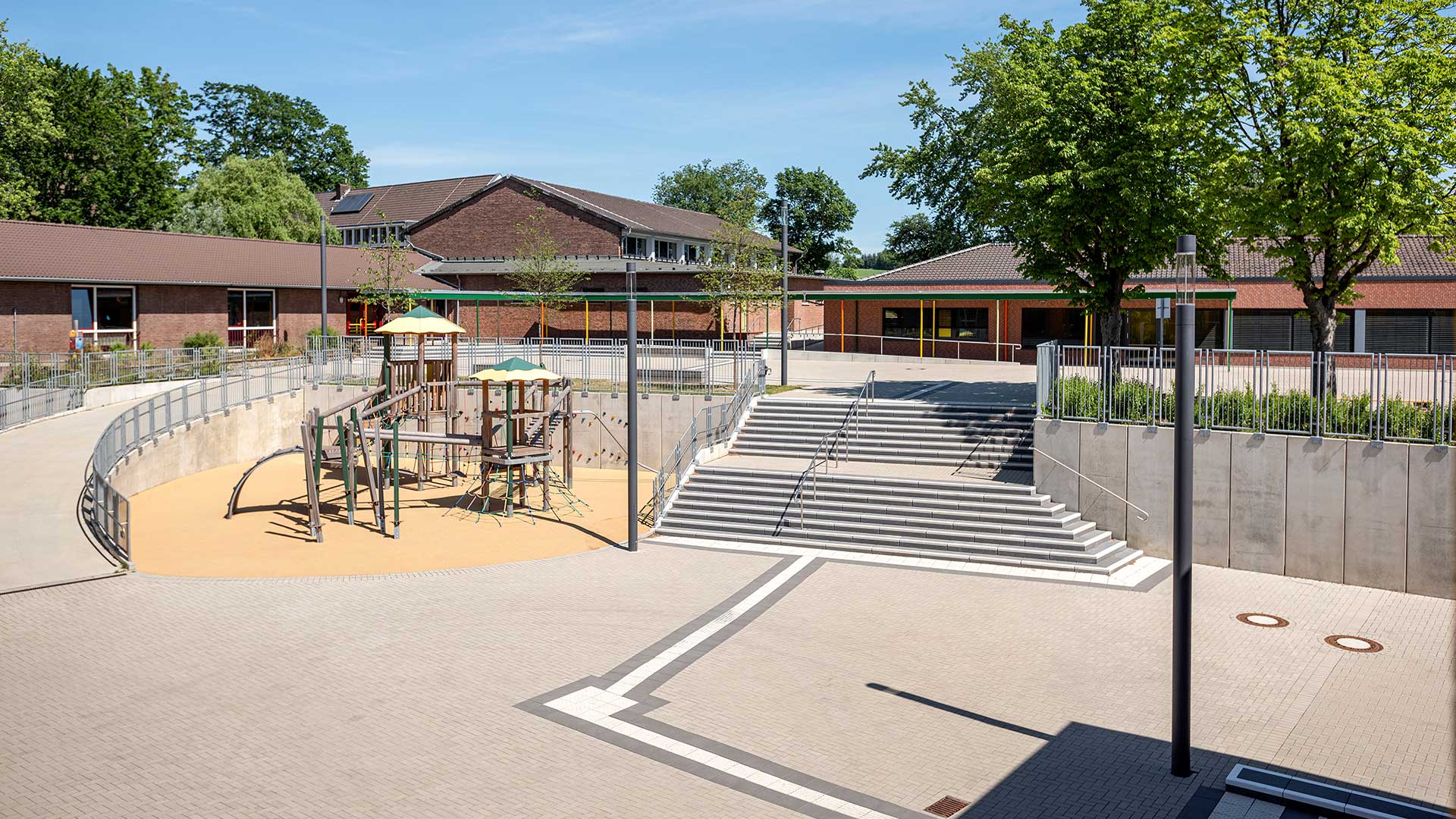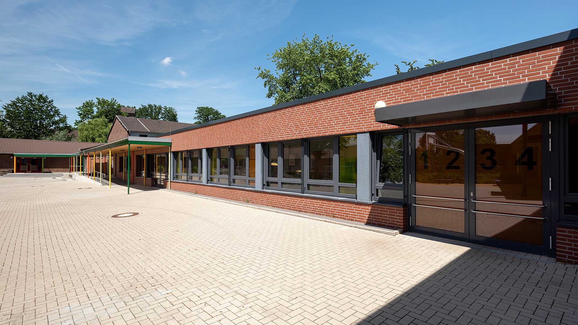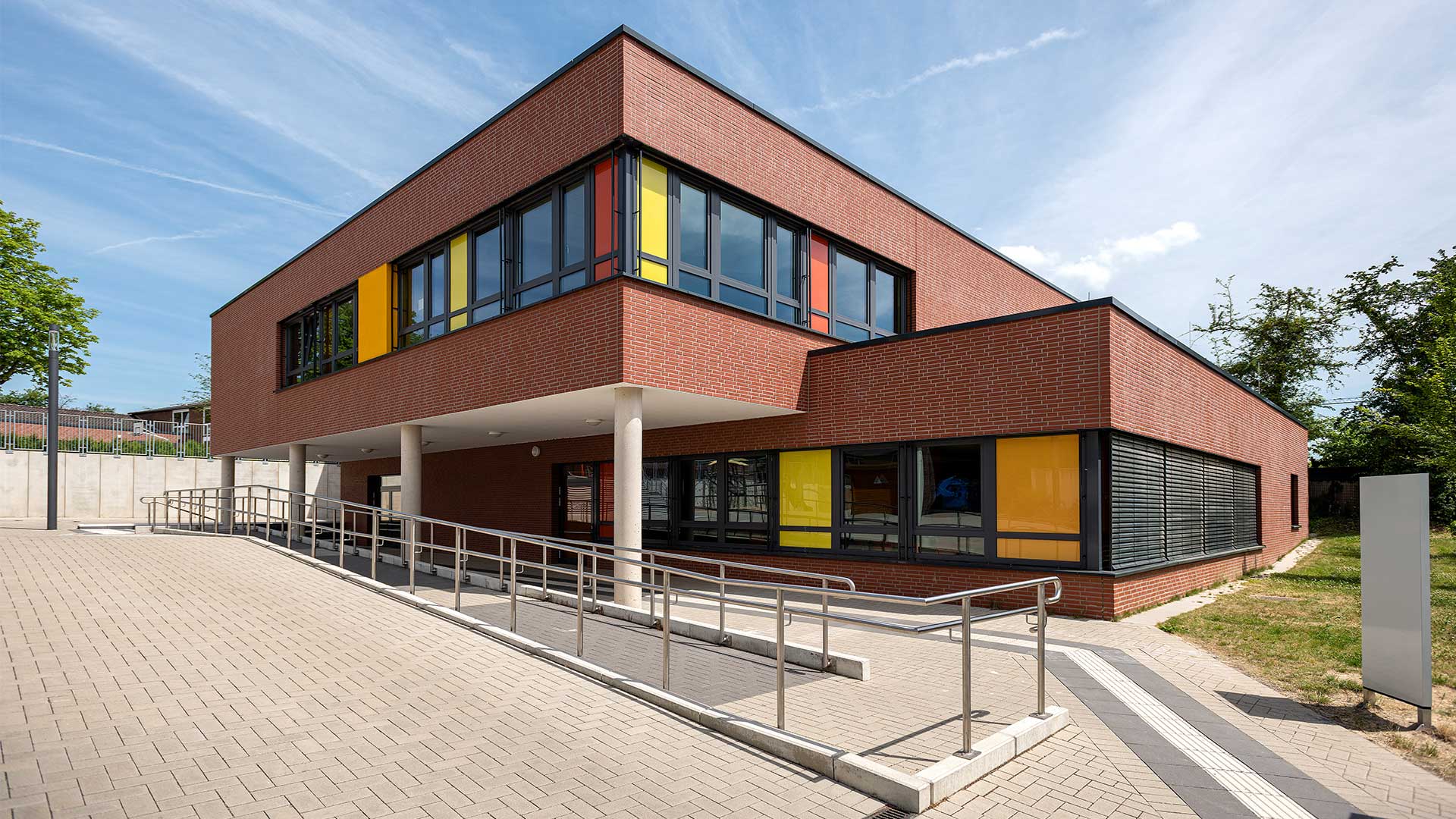 Der Gebäudebestand der Düsseldorfer Wichernschule aus dem Baujahr 1950 wird dem aktuellen Bedarf der Schule angepasst und erhält eine umfangreiche Erweiterung. Das Grundstück liegt an einem über 6 Höhenmeter überwindenden Südhang und ist durch seine Topografie gegliedert. So teilt ein Höhenversprung den mittig gelegenen Schulhof in zwei Ebenen. Der bestehende Gebäudekomplex folgt der Topographie und beinhaltet zwei Baukörper in L-Form. Die Erweiterung schließt die bestehenden Baulücken zwischen dem Bestand und rahmt den innenliegenden Schulhof. Der Neubau orientiert sich im Norden an die bestehende Gebäudeform nutzt dann aber die Topographie des Grundstücks, um in einen modernen zweigeschossigen Anbau im Süden zu übergehen. Durch ein zum Hof versetztes Erdgeschoss entsteht ein im Westen überdachter Eingangsbereich vor der neuen Mensa.