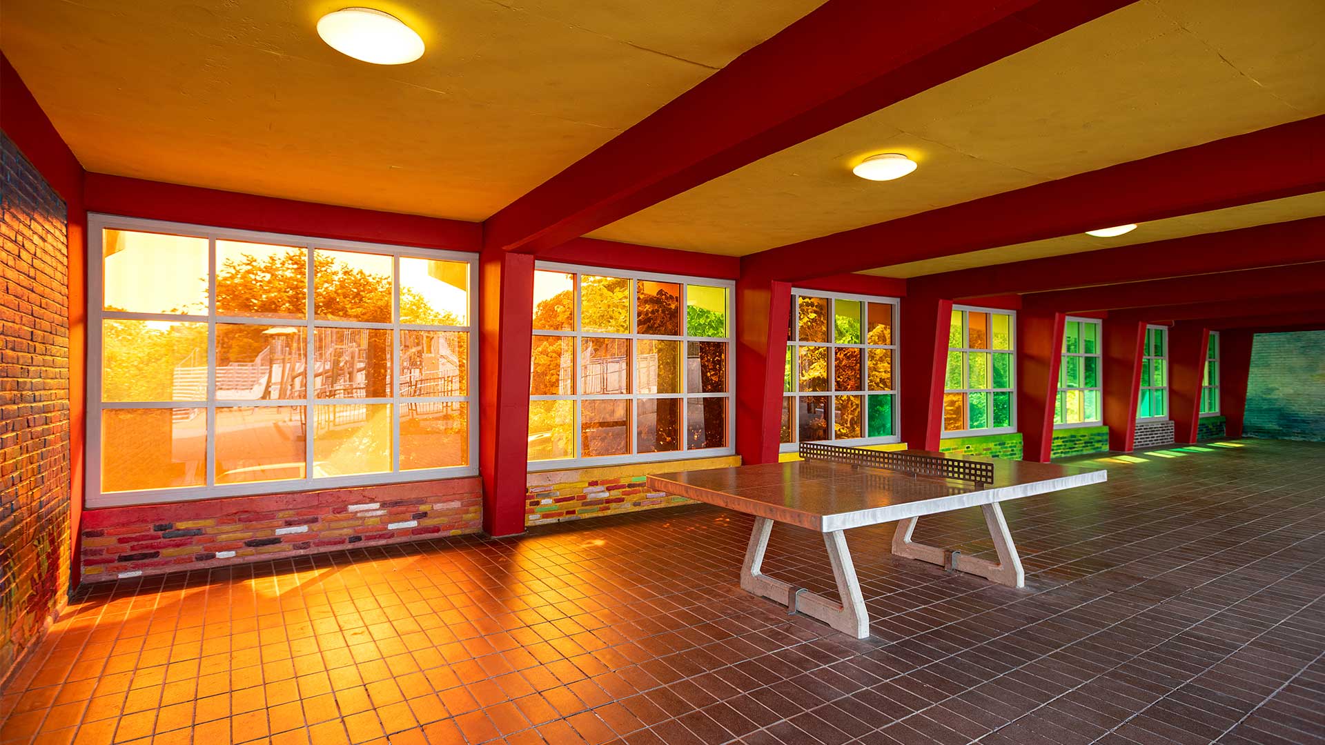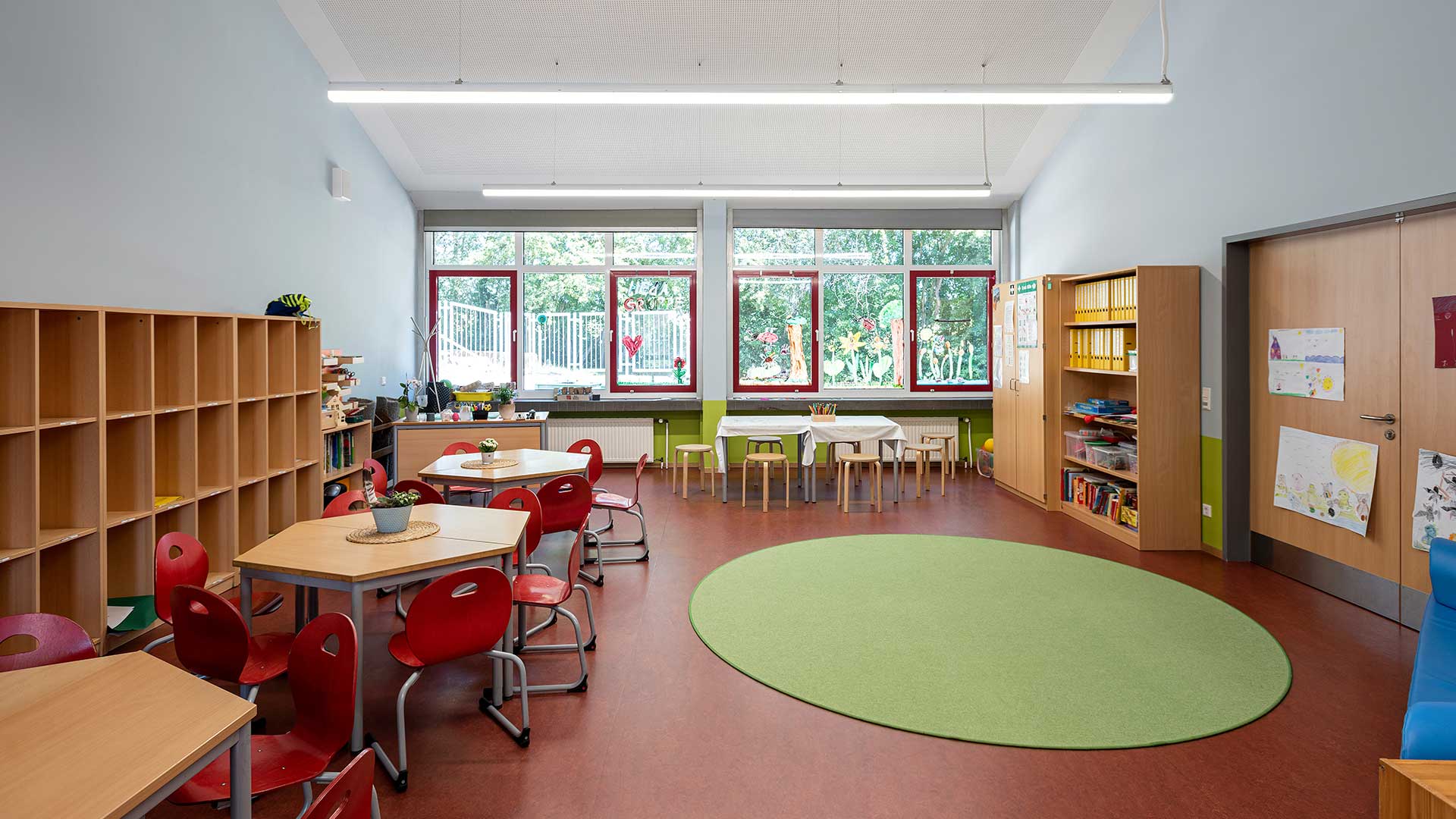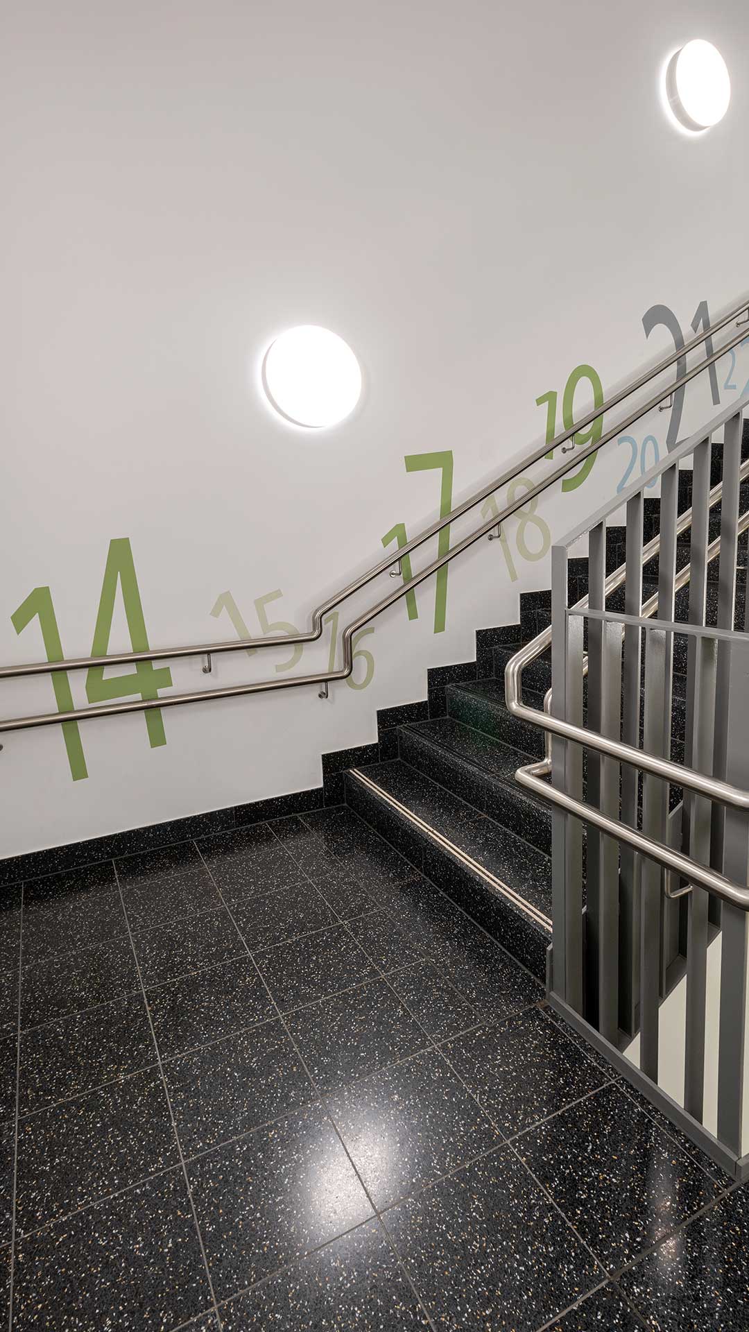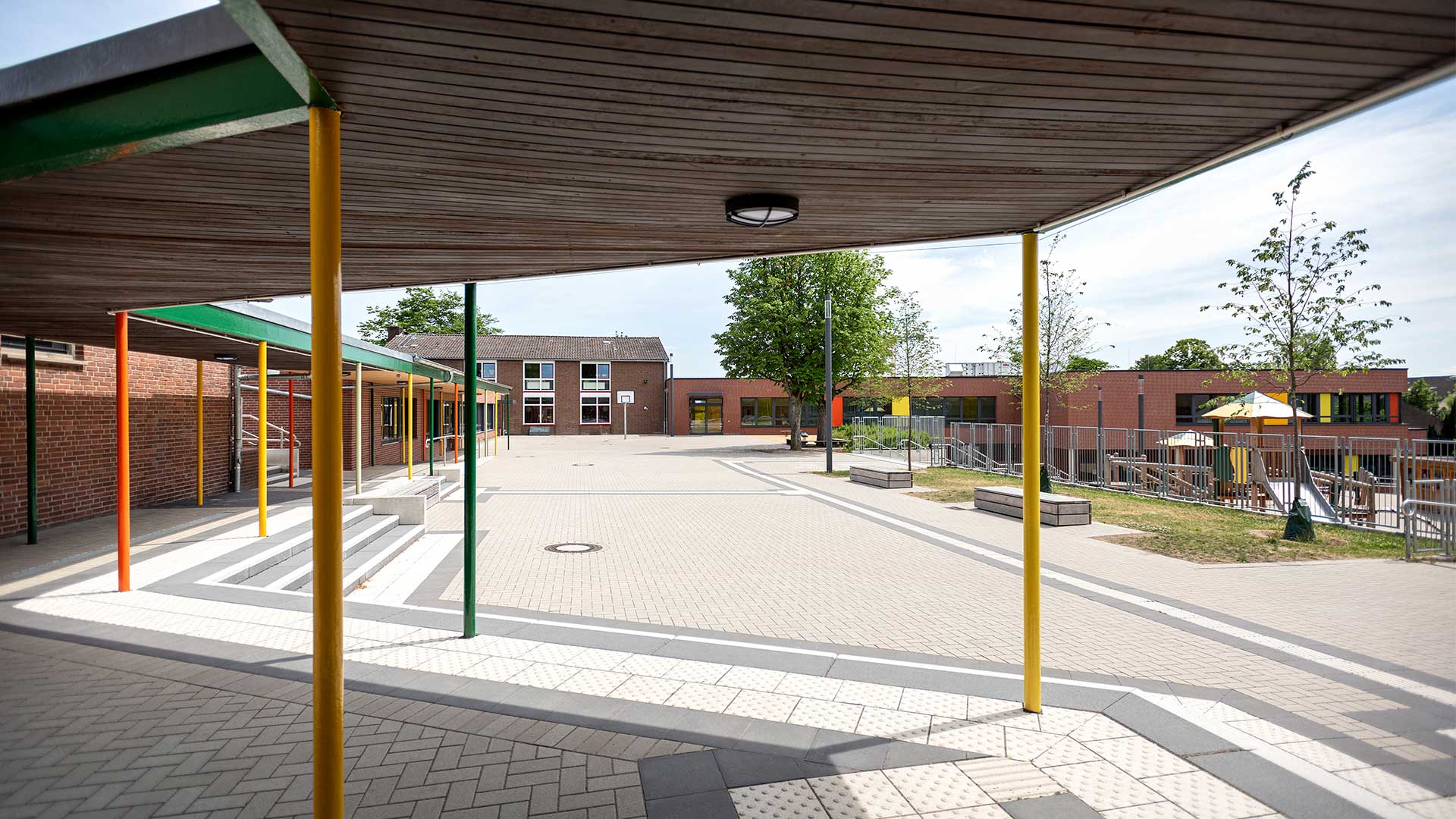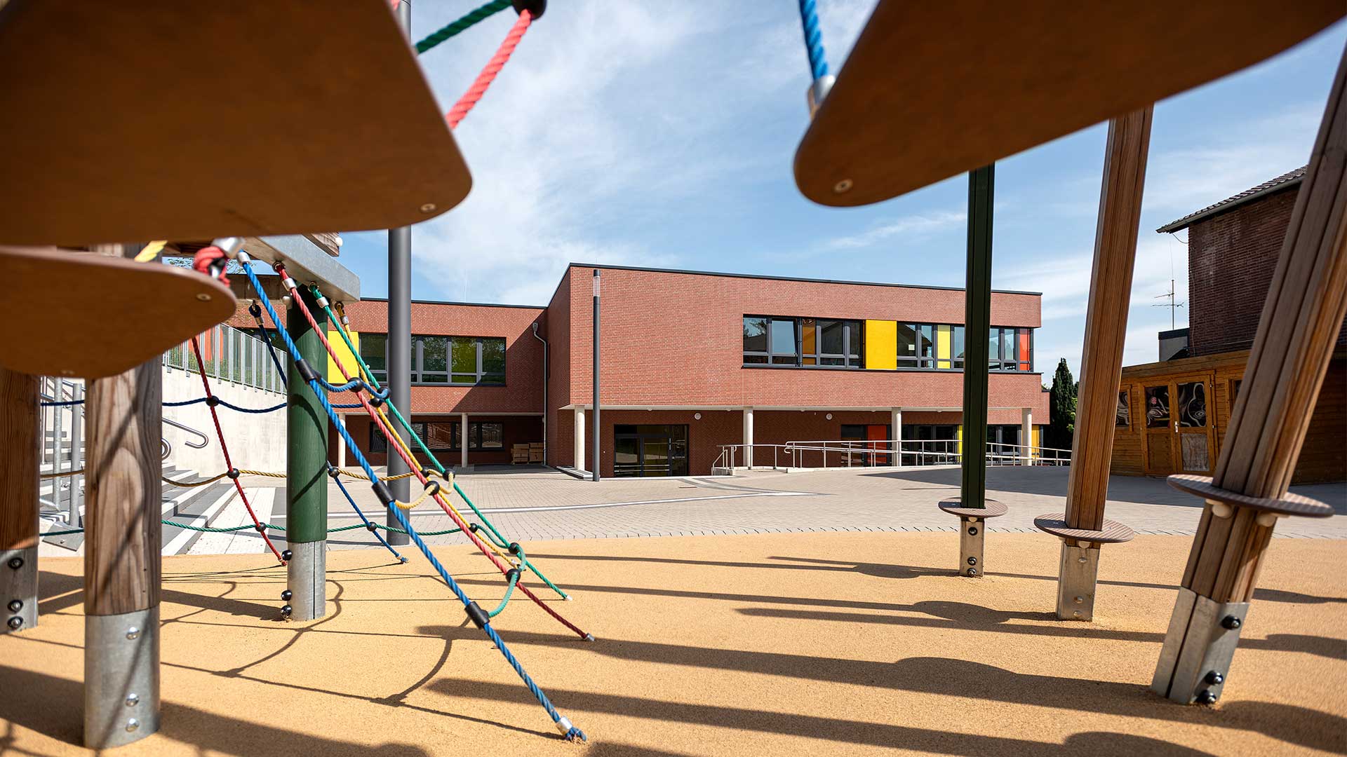 Der Gebäudebestand der Düsseldorfer Wichernschule aus dem Baujahr 1950 wird dem aktuellen Bedarf der Schule angepasst und erhält eine umfangreiche Erweiterung. Das Grundstück liegt an einem über 6 Höhenmeter überwindenden Südhang und ist durch seine Topografie gegliedert. So teilt ein Höhenversprung den mittig gelegenen Schulhof in zwei Ebenen. Der bestehende Gebäudekomplex folgt der Topographie und beinhaltet zwei Baukörper in L-Form. Die Erweiterung schließt die bestehenden Baulücken zwischen dem Bestand und rahmt den innenliegenden Schulhof. Der Neubau orientiert sich im Norden an die bestehende Gebäudeform nutzt dann aber die Topographie des Grundstücks, um in einen modernen zweigeschossigen Anbau im Süden zu übergehen. Durch ein zum Hof versetztes Erdgeschoss entsteht ein im Westen überdachter Eingangsbereich vor der neuen Mensa.