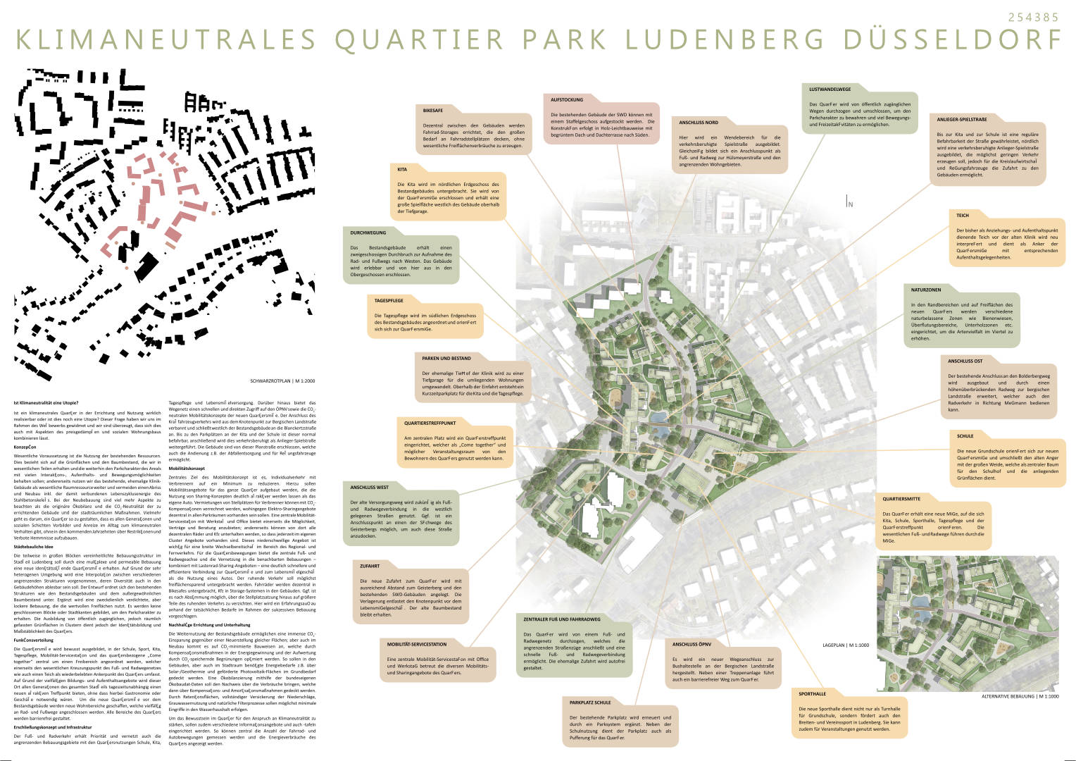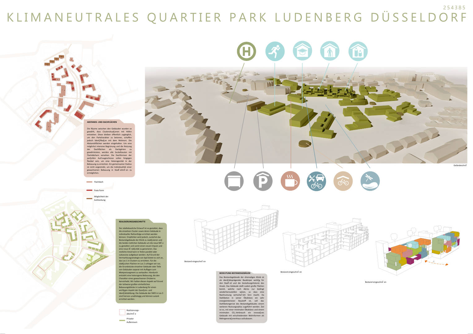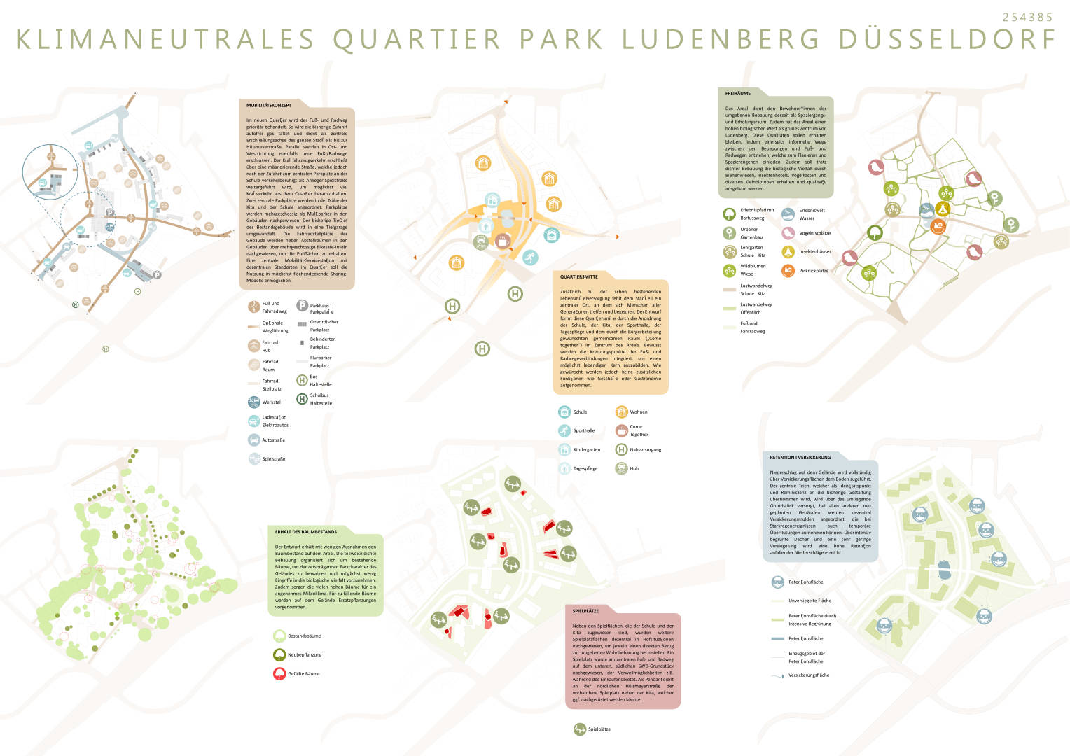 Die Stadt Düsseldorf plant im Stadteil Ludenberg ein neues Quartier. Wir haben hierzu ein städtebauliches Konzept mit einer neuen Quartiersmitte, einem möglichst geringen Fußabdruck und mit nachhaltiger Mobilität entwickelt. Der Schwerpunkt des Entwurfs lag auf einer möglichst klimaneutralen Gestaltung aller Lebensbereiche.